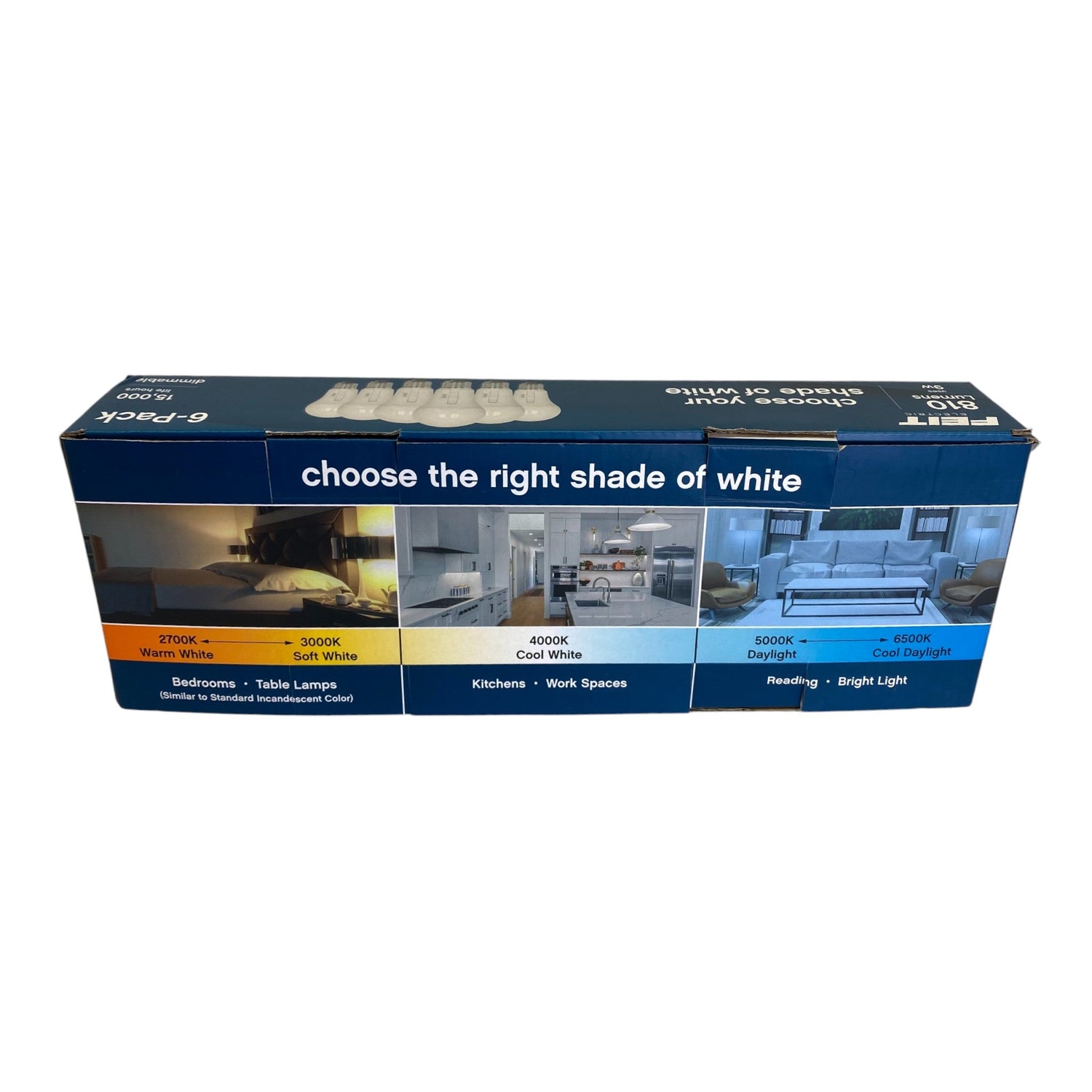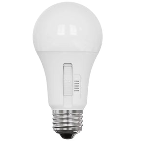 Enjoy bright light and advanced LED energy saving technology with the Feit Electric LED Light Bulb. This dimmable A19 bulb uses 9 watts, produces 810 lumens and allows you to select the colour temperature that suits the look and feel of your room. Choose between 2700K soft white, 3000K bright white, 4000K cool white, 5000K daylight or 6500K cool daylight directly from the bulb prior to installing. It installs like a regular light bulb and no additional hardware or special apps are required. The selectable white A19 bulb fits in E27 base sockets for use in bedrooms, living rooms, offices or anywhere you need warm relaxing light and cool energizing light all in the same room. With the selectable white feature, never have a mismatching shade of white light inside your house. This product features: